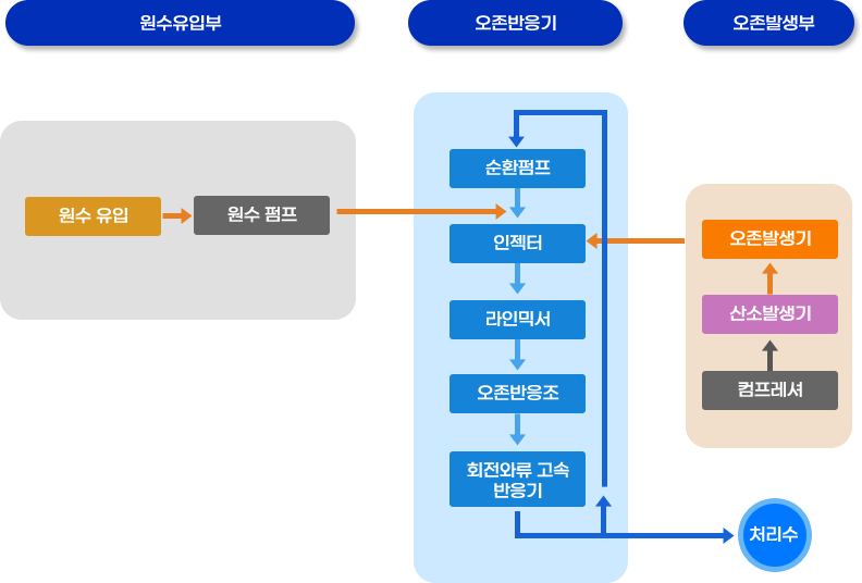 고효율 내부순환형 오존반응기 (I.C.O.R) 은 악취,난분해성 COD,색도 제거에 특화된 고효율 오존 반응기로 식품가공 CIP고농도폐수,육가공폐수 ,축산폐수,고농도산업폐수,고농도침출수 등에서 발생되는 난분해성 오염물질을 효율적으로 제거하기 위하여 기존 오존반응기의 단점을 개선한 오존반응기로 유입된 원수를 인젝터 와 LINE MIXER 를 이용하여 오존과 완전 혼합후 반응기내부에 내장된 회전와류고속반응기를 통해 오존반응을 가속화 시킨후 미 반응된 오존은 내부순환을 통하여 원수와 재 반응시켜 완전반응에 가깝게 반응 시킨 후 배출함으로서 배오존 발생을 최소화하여 오존의 사용량을 최적화하여 경제성을 재고 할 수 있으며 원수와 오존의 접촉시간을 최대화하여 처리효율을 극대화하는 것을 특징으로 하는 고효율 오존반응기이다
